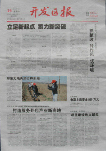 邢臺(tái)眾聯(lián)科技服務(wù)有限公司作為邢臺(tái)市服務(wù)外包產(chǎn)業(yè)的龍頭企業(yè),于3月10日分別在《河北日?qǐng)?bào)》第07版中國(guó)?國(guó)際版面及邢臺(tái)《開發(fā)區(qū)報(bào)》頭版以“打造服務(wù)外包產(chǎn)業(yè)新高地”為題,刊登了眾聯(lián)科技發(fā)展服務(wù)外包產(chǎn)業(yè)新聞。文中提到眾聯(lián)科技將充分發(fā)揮服務(wù)外包產(chǎn)業(yè)的帶頭作用,積極帶動(dòng)邢臺(tái)經(jīng)濟(jì)開發(fā)區(qū)服務(wù)外包產(chǎn)業(yè)的蓬勃發(fā)展。