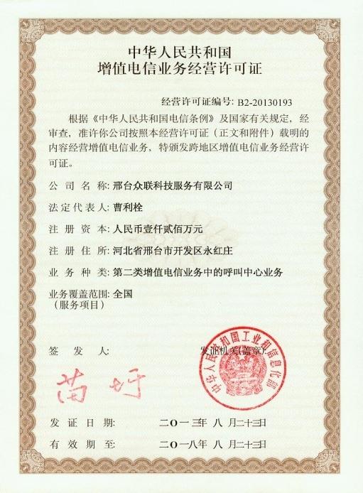 2013年8月23日 眾聯(lián)科技正式取得由國家工信部頒發(fā)的《中華人民共和國增值電信業(yè)務(wù)經(jīng)營許可證》。
