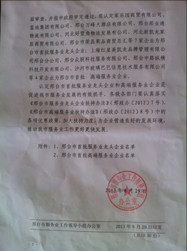 2013年9月23日,我公司接收由邢臺市服務業(yè)工作領(lǐng)導小組辦公室發(fā)布的《關(guān)于認定邢臺市首批服務業(yè)龍頭企業(yè)、高端服務業(yè)企業(yè)的通知》,通知中公布了邢臺市認定的7家首批服務業(yè)龍頭企業(yè)和4家高端服務業(yè)企業(yè)的名單,眾聯(lián)科技成功被認定為首批高端服務業(yè)企業(yè)。高端服務業(yè)企業(yè)的資格使得眾聯(lián)科技今后的發(fā)展道路更加平穩(wěn),政府部門會繼續(xù)加大扶持力度,給予各項優(yōu)惠政策,為公司創(chuàng)造良好的發(fā)展環(huán)境。